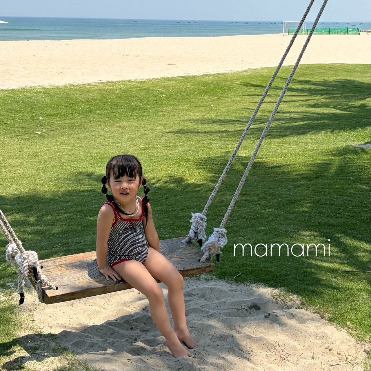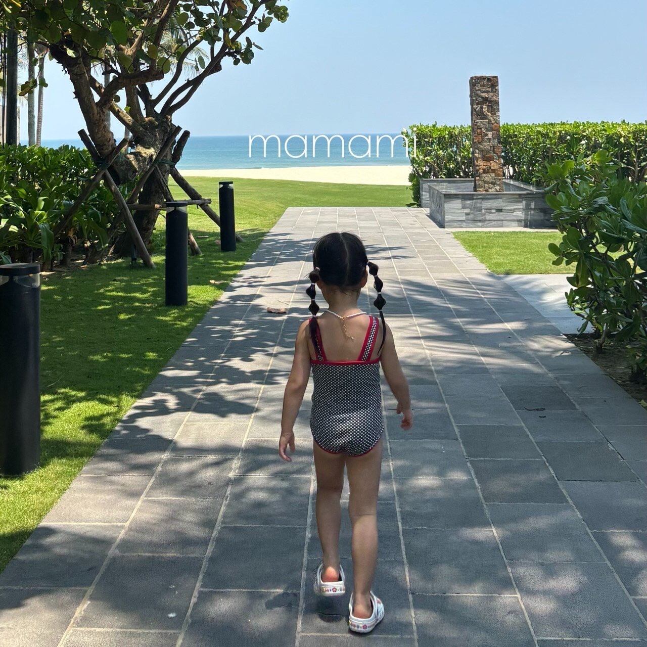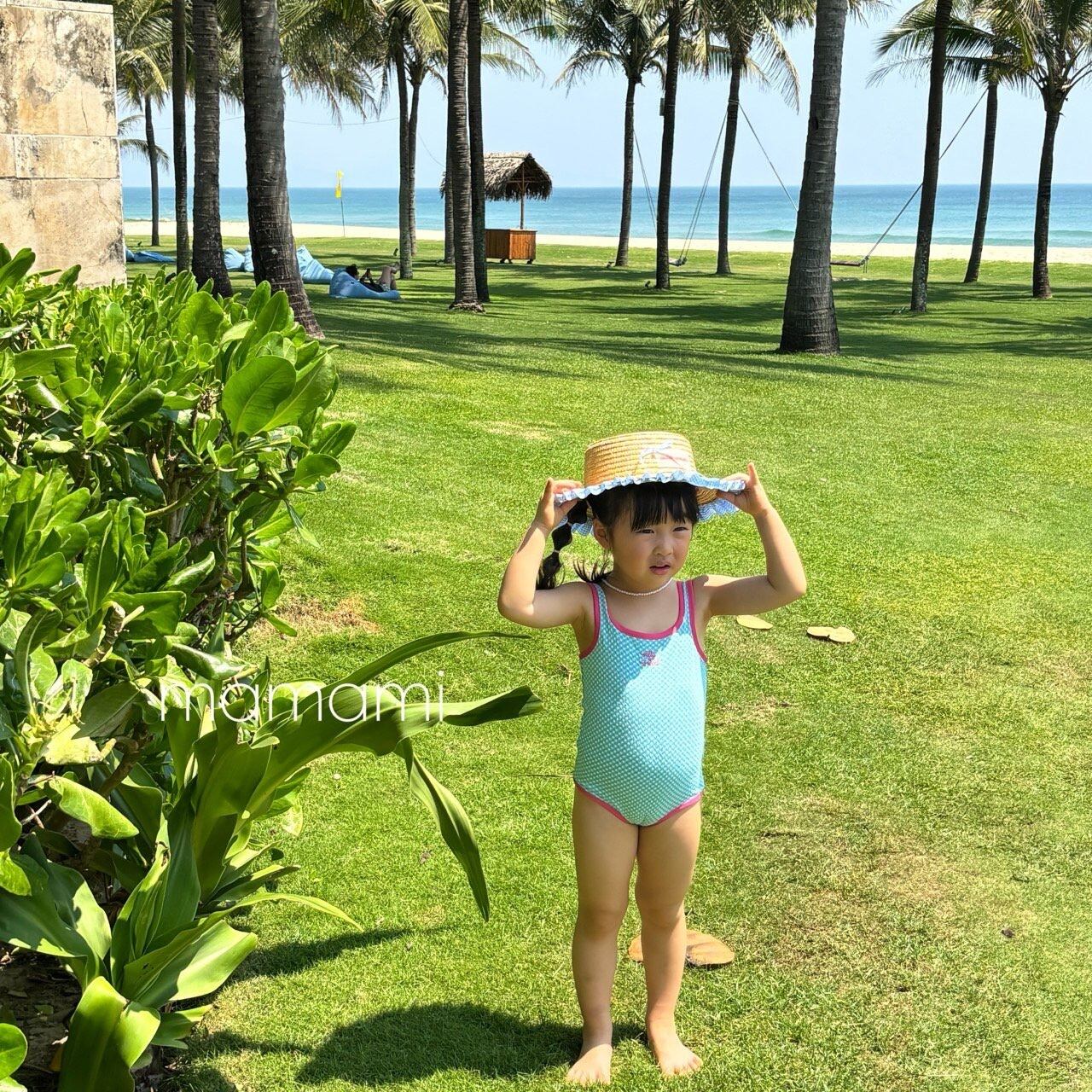 可愛く加えられた前面の刺繍ディテールと配色ラインのポイントが調和し、水遊びだけでなく旅行先でも目を引くサマースタイルを演出します。